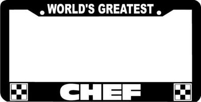 WORLD'S GREATEST CHEF License Plate Frame Plastic License Plate Frame Polystyrene plastic with vinyl graphics. Strong with tabs on the back to secure your plate to the frame. This is a buy it now for the frame pictured It is designed to fit a US/CANADA license plate.