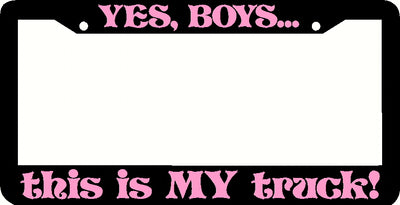 YES BOYS THIS IS MY TRUCK Plate Frame Plastic License Plate Frame Polystyrene plastic with vinyl graphics. Strong with tabs on the back to secure your plate to the frame. This is a buy it now for the frame pictured It is designed to fit a US/CANADA license plate.