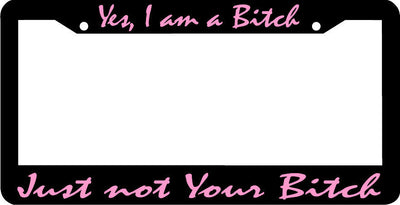 Yes I am a bitch just not your bitch License Plate Frame Plastic License Plate Frame Polystyrene plastic with vinyl graphics. Strong with tabs on the back to secure your plate to the frame. This is a buy it now for the frame pictured It is designed to fit a US/CANADA license plate.