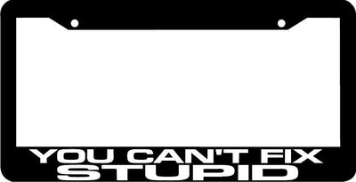 YOU CAN'T FIX STUPID License Plate Frame Plastic License Plate Frame Polystyrene plastic with vinyl graphics. Strong with tabs on the back to secure your plate to the frame. This is a buy it now for the frame pictured It is designed to fit a US/CANADA license plate.