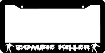 ZOMBIE KILLER License Plate Frame Plastic License Plate Frame Polystyrene plastic with vinyl graphics. Strong with tabs on the back to secure your plate to the frame. This is a buy it now for the frame pictured It is designed to fit a US/CANADA license plate.