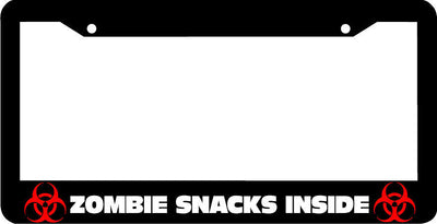 ZOMBIE SNACKS INSIDE License Plate Frame Plastic License Plate Frame Polystyrene plastic with vinyl graphics. Strong with tabs on the back to secure your plate to the frame. This is a buy it now for the frame pictured It is designed to fit a US/CANADA license plate.