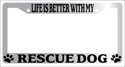 Chrome METAL License Plate Frame LIFE IS BETTER WITH MY RESCUE DOG 629 Mod-GRAPH9856236-9126
