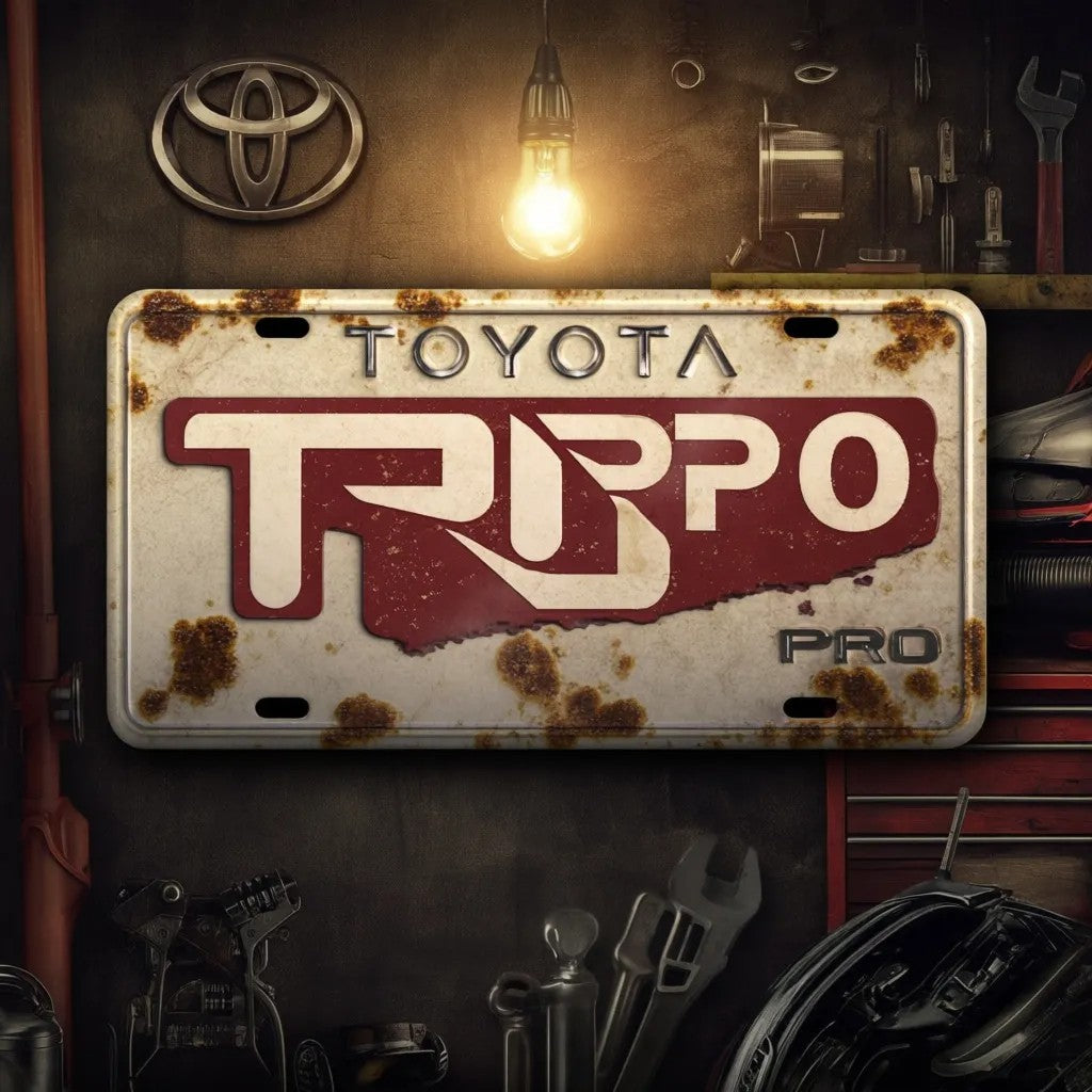An artistic interpretation of a Toyota TRD Pro license plate, designed as a vintage metal sign The plate features a distressed look with rust spots around the edges, showcasing &