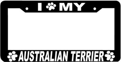 Australian Terrier Dog paw print License Plate Frame Plastic License Plate Frame Polystyrene plastic with vinyl graphics. Strong with tabs on the back to secure your plate to the frame. This is a buy it now for the frame pictured It is designed to fit a US/CANADA license plate.