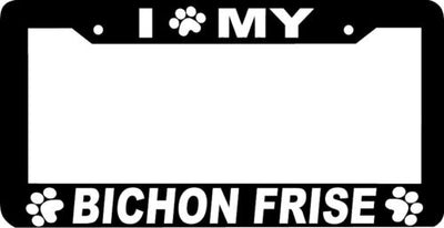 BICHON FRISE Dog paw print License Plate Frame Plastic License Plate Frame Polystyrene plastic with vinyl graphics. Strong with tabs on the back to secure your plate to the frame. This is a buy it now for the frame pictured It is designed to fit a US/CANADA license plate.