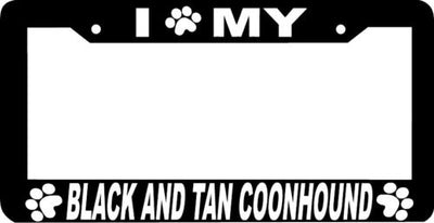BLACK AND TAN COONHOUND paw print License Plate Frame Plastic License Plate Frame Polystyrene plastic with vinyl graphics. Strong with tabs on the back to secure your plate to the frame. This is a buy it now for the frame pictured It is designed to fit a US/CANADA license plate.