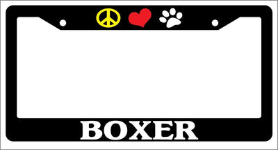 Black License Plate Frame Peace Love Paw Boxer Auto Accessory Novelty Peace Love Paw Boxer Black license plate frame made from high impact ABS plastic, covered with color vinyl printing. This frame is designed to last. These frames will last longer than your car.