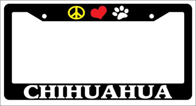 Black License Plate Frame Peace Love Paw Chihuahua Auto Accessory Novelty Peace Love Paw Chihuahua Black license plate frame made from high impact ABS plastic, covered with color vinyl printing. This frame is designed to last. These frames will last longer than your car.