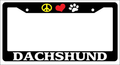 Black License Plate Frame Peace love Paw Dachshund Auto Accessory Novelty Peace love Paw Dachshund Black license plate frame made from high impact ABS plastic, covered with color vinyl printing. This frame is designed to last. These frames will last longer than your car.