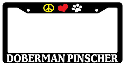 Black License Plate Frame Peace Love Paw Doberman Pinscher Auto Accessory Peace Love Paw Doberman Pinscher Black license plate frame made from high impact ABS plastic, covered with color vinyl printing. This frame is designed to last. These frames will last longer than your car.