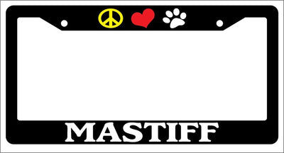 Black License Plate Frame Peace Love Paw Mastiff Auto Accessory Novelty Peace Love Paw Mastiff Black license plate frame made from high impact ABS plastic, covered with color vinyl printing. This frame is designed to last. These frames will last longer than your car.