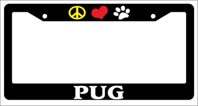 Black License Plate Frame Peace Love Paw Pug Auto Accessory Novelty Peace Love Paw Pug Black license plate frame made from high impact ABS plastic, covered with color vinyl printing. This frame is designed to last. These frames will last longer than your car.