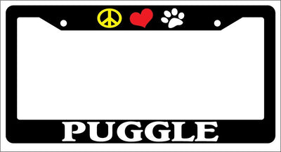 Black License Plate Frame Peace Love Paw Puggle Auto Accessory Novelty Peace Love Paw Puggle Black license plate frame made from high impact ABS plastic, covered with color vinyl printing. This frame is designed to last. These frames will last longer than your car.