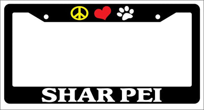 Black License Plate Frame Peace Love Paw Shar Pei Auto Accessory Novelty Peace Love Paw Shar Pei Black license plate frame made from high impact ABS plastic, covered with color vinyl printing. This frame is designed to last. These frames will last longer than your car.