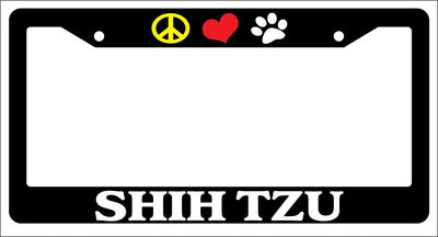 Black License Plate Frame Peace Love Paw Shih Tzu Auto Accessory Novelty Peace Love Paw Shih Tzu Black license plate frame made from high impact ABS plastic, covered with color vinyl printing. This frame is designed to last. These frames will last longer than your car.