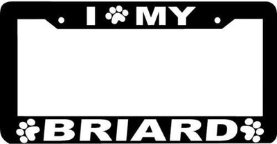 BRIARD DOG paw print License Plate Plastic License Plate Frame Polystyrene plastic with vinyl graphics. Strong with tabs on the back to secure your plate to the frame. This is a buy it now for the frame pictured It is designed to fit a US/CANADA license plate.