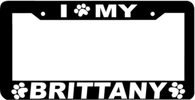 BRITTANY DOG paw print License Plate Frame Plastic License Plate Frame Polystyrene plastic with vinyl graphics. Strong with tabs on the back to secure your plate to the frame. This is a buy it now for the frame pictured It is designed to fit a US/CANADA license plate.