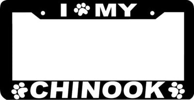 CHINOOK DOG paw print License Plate Frame Plastic License Plate Frame Polystyrene plastic with vinyl graphics. Strong with tabs on the back to secure your plate to the frame. This is a buy it now for the frame pictured It is designed to fit a US/CANADA license plate.