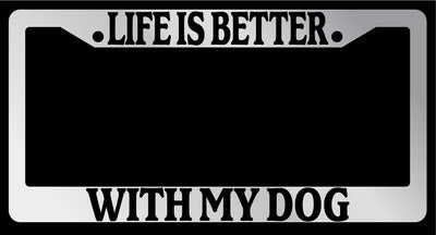 Chrome License Plate Frame "Life is Better, With My Dog" Auto Accessory Novelty Chrome license plate frame made from high impact ABS plastic, chrome plated, and covered with color vinyl printing. This frame is designed to last. Steel chrome frames when they get scratched will rust and rot away. These frames will last longer than your car.