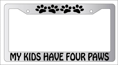 Chrome License Plate Frame MY KIDS HAVE FOUR PAWS Auto Accessory Chrome license plate frame MY KIDS HAVE FOUR PAWS made from high impact ABS plastic, chrome plated, and covered with color vinyl printing. This frame is designed to last. Steel chrome frames when they get scratched will rust and rot away. These frames will last longer than your car.