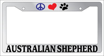 Chrome License Plate Frame Peace Love Paw Australian Shepherd Auto Accessory Peace Love Paw Australian Shepherd Chrome license plate frame made from high impact ABS plastic, chrome plated, and covered with color vinyl printing. This frame is designed to last. Steel chrome frames when they get scratched will rust and rot away. These frames will last longer than your car.