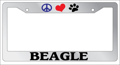 Chrome License Plate Frame Peace Love Paw Beagle Auto Accessory Novelty Peace Love Paw Beagle Chrome license plate frame made from high impact ABS plastic, chrome plated, and covered with color vinyl printing. This frame is designed to last. Steel chrome frames when they get scratched will rust and rot away. These frames will last longer than your car.
