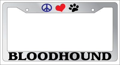Chrome License Plate Frame Peace Love Paw Bloodhound Auto Accessory Novelty Peace Love Paw Bloodhound Chrome license plate frame made from high impact ABS plastic, chrome plated, and covered with color vinyl printing. This frame is designed to last. Steel chrome frames when they get scratched will rust and rot away. These frames will last longer than your car.