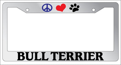 Chrome License Plate Frame Peace Love Paw Bull Terrier Auto Accessory Novelty Peace Love Paw Bull Terrier Chrome license plate frame made from high impact ABS plastic, chrome plated, and covered with color vinyl printing. This frame is designed to last. Steel chrome frames when they get scratched will rust and rot away. These frames will last longer than your car.