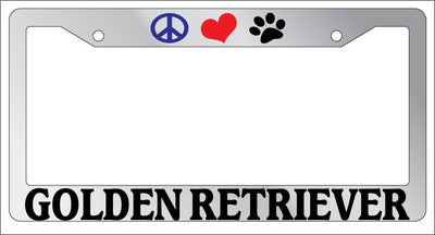 Chrome License Plate Frame Peace Love Paw Golden Retriever Auto Accessory Peace Love Paw Golden Retriever Chrome license plate frame made from high impact ABS plastic, chrome plated, and covered with color vinyl printing. This frame is designed to last. Steel chrome frames when they get scratched will rust and rot away. These frames will last longer than your car.