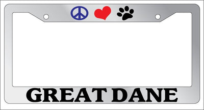 Chrome License Plate Frame Peace Love Paw Great Dane Auto Accessory Novelty Peace Love Paw Great Dane Chrome license plate frame made from high impact ABS plastic, chrome plated, and covered with color vinyl printing. This frame is designed to last. Steel chrome frames when they get scratched will rust and rot away. These frames will last longer than your car.
