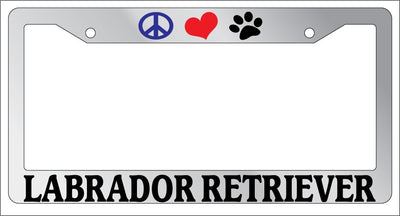 Chrome License Plate Frame Peace Love Paw Labrador Retriever Auto Accessory Peace Love Paw Labrador Retriever Chrome license plate frame made from high impact ABS plastic, chrome plated, and covered with color vinyl printing. This frame is designed to last. Steel chrome frames when they get scratched will rust and rot away. These frames will last longer than your car.