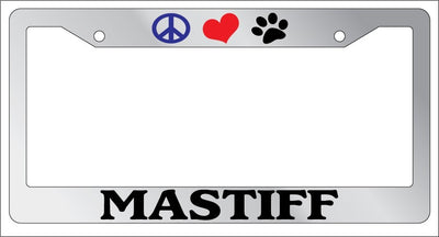 Chrome License Plate Frame Peace Love Paw Mastiff Auto Accessory Novelty Peace Love Paw Mastiff Chrome license plate frame made from high impact ABS plastic, chrome plated, and covered with color vinyl printing. This frame is designed to last. Steel chrome frames when they get scratched will rust and rot away. These frames will last longer than your car.