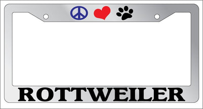Chrome License Plate Frame Peace Love Paw Rottweiler Auto Accessory Novelty Peace Love Paw Rottweiler Chrome license plate frame made from high impact ABS plastic, chrome plated, and covered with color vinyl printing. This frame is designed to last. Steel chrome frames when they get scratched will rust and rot away. These frames will last longer than your car.