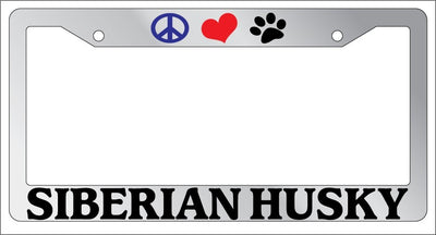 Chrome License Plate Frame Peace Love Paw Siberian Husky Auto Accessory Novelty Peace Love Paw Siberian Husky Chrome license plate frame made from high impact ABS plastic, chrome plated, and covered with color vinyl printing. This frame is designed to last. Steel chrome frames when they get scratched will rust and rot away. These frames will last longer than your car.