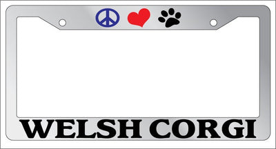 Chrome License Plate Frame Peace Love Paw Welsh Corgi Auto Accessory Novelty Peace Love Paw Welsh Corgi Chrome license plate frame made from high impact ABS plastic, chrome plated, and covered with color vinyl printing. This frame is designed to last. Steel chrome frames when they get scratched will rust and rot away. These frames will last longer than your car.