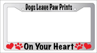 Chrome Metal License Plate Frame DOGS LEAVE PAW PRINTS Auto Accessory Chrome Metal license plate frame DOGS LEAVE PAW PRINTS made from high quality steel plated in chrome, covered with premium outdoor color vinyl printing with a minimum life expectancy of 7 year. The vinyl is designed to stand up to the elements and will not peel off in car washes or other elements your car may be subjected to. This frame is designed to last. Designed to withstand outdoor conditions We do all kinds of different products.