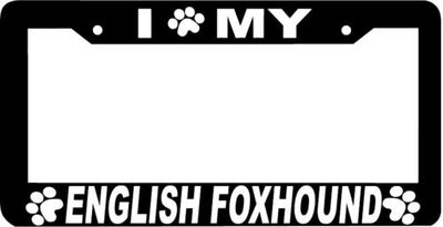 ENGLISH FOXHOUND DOG paw print License Plate Frame Plastic License Plate Frame Polystyrene plastic with vinyl graphics. Strong with tabs on the back to secure your plate to the frame. This is a buy it now for the frame pictured It is designed to fit a US/CANADA license plate.