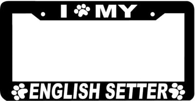 ENGLISH SETTER DOG paw print License Plate Frame Plastic License Plate Frame Polystyrene plastic with vinyl graphics. Strong with tabs on the back to secure your plate to the frame. This is a buy it now for the frame pictured It is designed to fit a US/CANADA license plate.