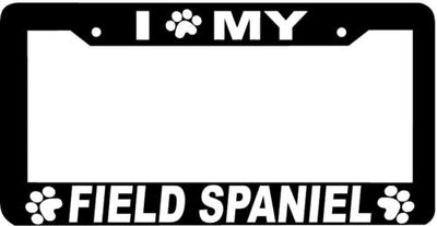 FIELD SPANIEL DOG paw print License Plate Frame Plastic License Plate Frame Polystyrene plastic with vinyl graphics. Strong with tabs on the back to secure your plate to the frame. This is a buy it now for the frame pictured It is designed to fit a US/CANADA license plate.