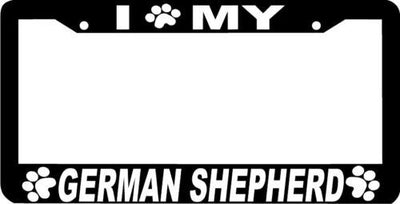 GERMAN SHEPHERD PAW PRINT DOG License Plate Frame Plastic License Plate Frame Polystyrene plastic with vinyl graphics. Strong with tabs on the back to secure your plate to the frame. This is a buy it now for the frame pictured It is designed to fit a US/CANADA license plate.