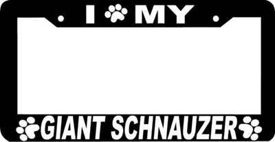 GIANT SCHNAUZER DOG paw License Plate Frame Plastic License Plate Frame Polystyrene plastic with vinyl graphics. Strong with tabs on the back to secure your plate to the frame. This is a buy it now for the frame pictured It is designed to fit a US/CANADA license plate.