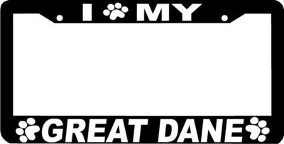 GREAT DANE PAW PRINT DOG License Plate Frame Plastic License Plate Frame Polystyrene plastic with vinyl graphics. Strong with tabs on the back to secure your plate to the frame. This is a buy it now for the frame pictured It is designed to fit a US/CANADA license plate.