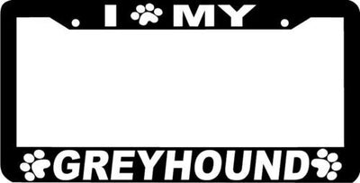 GREYHOUND PAW PRINT DOG License Plate Frame Plastic License Plate Frame Polystyrene plastic with vinyl graphics. Strong with tabs on the back to secure your plate to the frame. This is a buy it now for the frame pictured It is designed to fit a US/CANADA license plate.