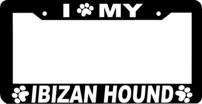 IBIZAN HOUND DOG paw print License Plate Frame Plastic License Plate Frame Polystyrene plastic with vinyl graphics. Strong with tabs on the back to secure your plate to the frame. This is a buy it now for the frame pictured It is designed to fit a US/CANADA license plate.