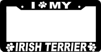 IRISH TERRIER DOG paw print License Plate Frame Plastic License Plate Frame Polystyrene plastic with vinyl graphics. Strong with tabs on the back to secure your plate to the frame. This is a buy it now for the frame pictured It is designed to fit a US/CANADA license plate.