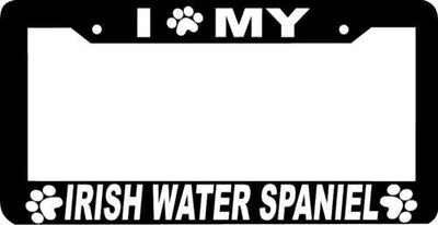 IRISH WATER SPANIEL paw print License Plate Frame Plastic License Plate Frame Polystyrene plastic with vinyl graphics. Strong with tabs on the back to secure your plate to the frame. This is a buy it now for the frame pictured It is designed to fit a US/CANADA license plate.