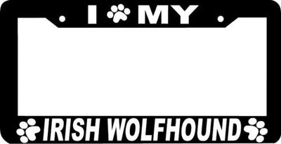 IRISH WOLFHOUND paw print License Plate Frame Plastic License Plate Frame Polystyrene plastic with vinyl graphics. Strong with tabs on the back to secure your plate to the frame. This is a buy it now for the frame pictured It is designed to fit a US/CANADA license plate.