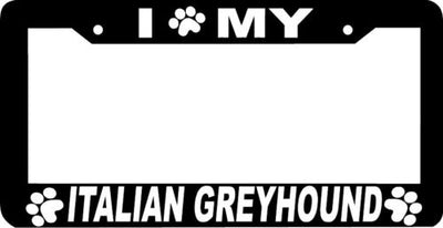 ITALIAN GREYHOUND DOG paw print License Plate Framee Plastic License Plate Frame Polystyrene plastic with vinyl graphics. Strong with tabs on the back to secure your plate to the frame. This is a buy it now for the frame pictured It is designed to fit a US/CANADA license plate.