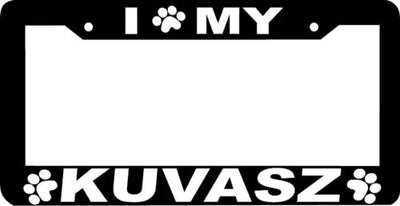 KUVASZ DOG paw print License Plate Frame Plastic License Plate Frame Polystyrene plastic with vinyl graphics. Strong with tabs on the back to secure your plate to the frame. This is a buy it now for the frame pictured It is designed to fit a US/CANADA license plate.